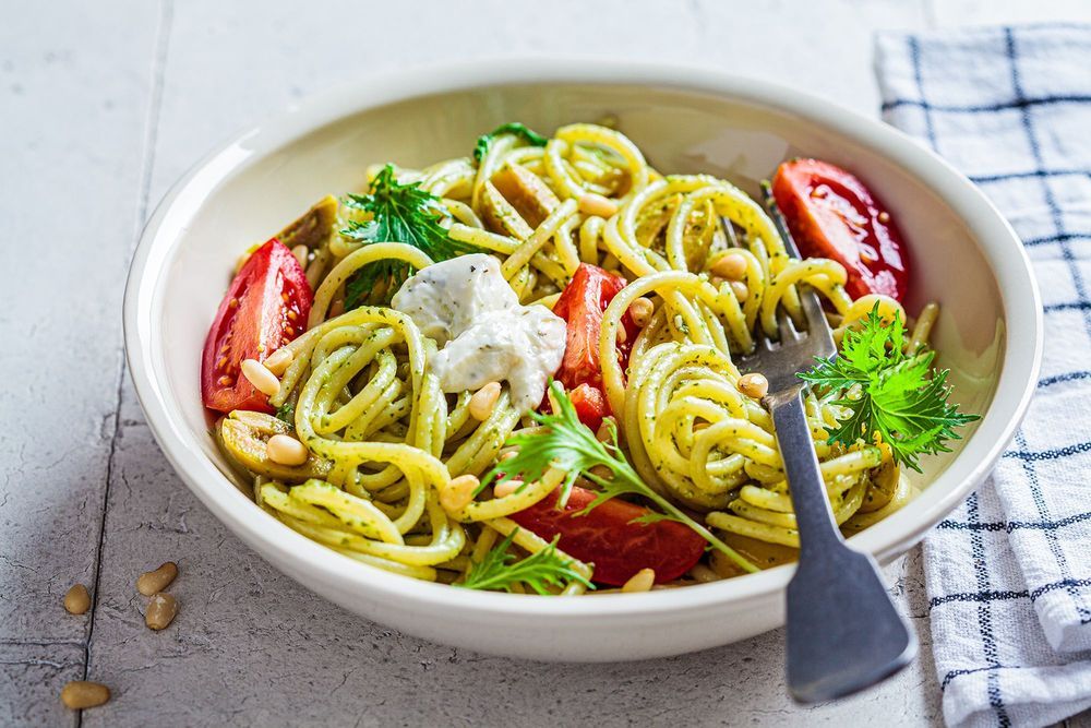 Pasta al pesto y queso de cabra
